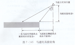 電視轉(zhuǎn)播不僅要求有水平照度,還要求有4個(gè)方向的垂直照度。同時(shí)為保證拍攝畫(huà)面的立體感,水平照度與垂直照度之比Eh/Ev應(yīng)在0.5-2之間。以圖7-145為例,燈具近側(cè)瞄準(zhǔn)點(diǎn)的投射角α1不宜太小,而遠(yuǎn)側(cè)瞄準(zhǔn)點(diǎn)的投射角α2又不宜太大。如果投射角α1太小,則垂直照度分量太小,不能滿(mǎn)足Eh/Ev 的比例要求,如果投射角α2太大,則會(huì)產(chǎn)生嚴(yán)重眩光。