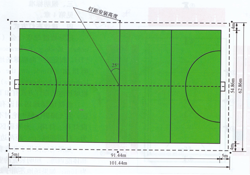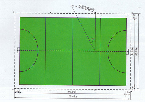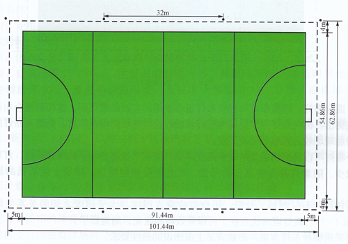 曲棍球場地四周設有無障礙區(qū),在障礙區(qū)域內(nèi)絕對不允許裝設燈桿,燈塔。無障礙區(qū)域最小為:距兩底線5m,距兩邊線4m。