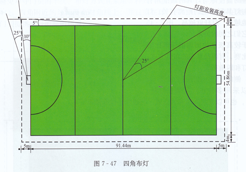 如圖7-47所示,燈具安裝在曲棍球場四角的燈桿或燈塔上。