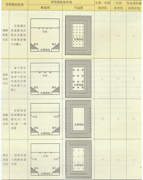 2. 燈具在場地上空和側(cè)面布置相結(jié)合。這種布置一般適用于多功能體育館,水平照度和垂直照度可以獲得適當(dāng)?shù)谋嚷省?/span>