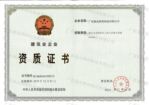 揚光照明取得城市及道路照明工程專業(yè)承包壹級資質(zhì)