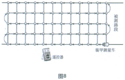 本方案是將具有記憶和存貯功能的TES-1333型照度記安置在高檔電動(dòng)遙控的履帶式玩具裝甲車(以下簡(jiǎn)稱為測(cè)試小車)上,該測(cè)試小車的驅(qū)動(dòng)系統(tǒng)受站在路邊的測(cè)量者手中的遙控器和測(cè)試小車內(nèi)安置的可編程控制器為主體的自動(dòng)控制系統(tǒng)控制,當(dāng)車內(nèi)的自動(dòng)控制系統(tǒng)啟動(dòng)時(shí),裝甲車將按照事先設(shè)定的動(dòng)作程序沿如圖8所示的箭頭方向完成行走程序,并采用四點(diǎn)法在每個(gè)矩形網(wǎng)格的四角處自動(dòng)完成照度測(cè)量和記錄,存貯任務(wù),待全部程序結(jié)束后,測(cè)試小車在遙控器的操縱下自動(dòng)返回測(cè)量者所在位置。遙控器的另一作用是在車內(nèi)控制系統(tǒng)失靈的情況下,由測(cè)量者手動(dòng)遙控完成全部的測(cè)量過程,并在道路出現(xiàn)行駛車輛時(shí)緊急召回測(cè)試小車。