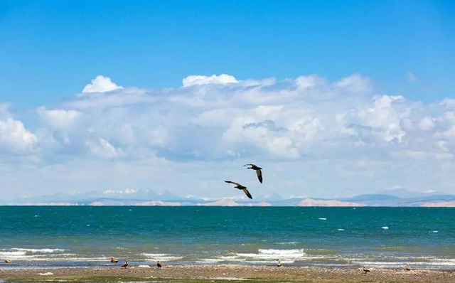 經(jīng)過(guò)日月山,到達(dá)青海湖。青海湖又名“措溫布”,即藏語(yǔ)“青色的?!敝猓挥谇嗪J∥鞅辈康那嗪:璧貎?nèi),既是中國(guó)最大的內(nèi)陸湖泊,也是中國(guó)最大的咸水湖。由祁連山的大通山、日月山與青海南山之間的斷層陷落形成。