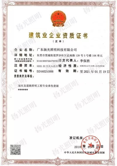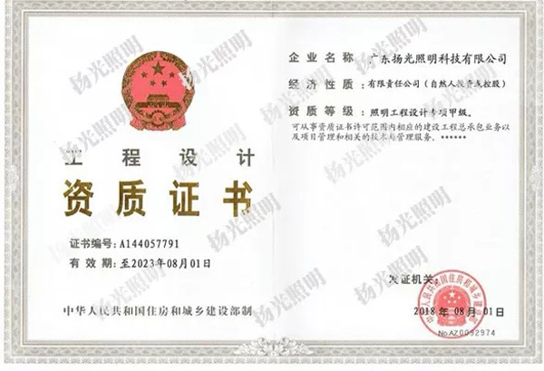 近日,揚(yáng)光照明成功取得了由國家住房與城鄉(xiāng)建設(shè)部頒發(fā)照明工程設(shè)計(jì)專項(xiàng)資質(zhì)甲級(jí),至此,公司已成為全國為數(shù)不多的城市及道路照明工程施工壹級(jí),照明工程設(shè)計(jì)專項(xiàng)資質(zhì)甲級(jí)的“雙甲”企業(yè),“雙甲”資質(zhì)的取得體現(xiàn)了行業(yè)和市場對(duì)公司綜合實(shí)力的高度認(rèn)可,意味著可以承接任何規(guī)模的照明設(shè)計(jì)與施工項(xiàng)目。