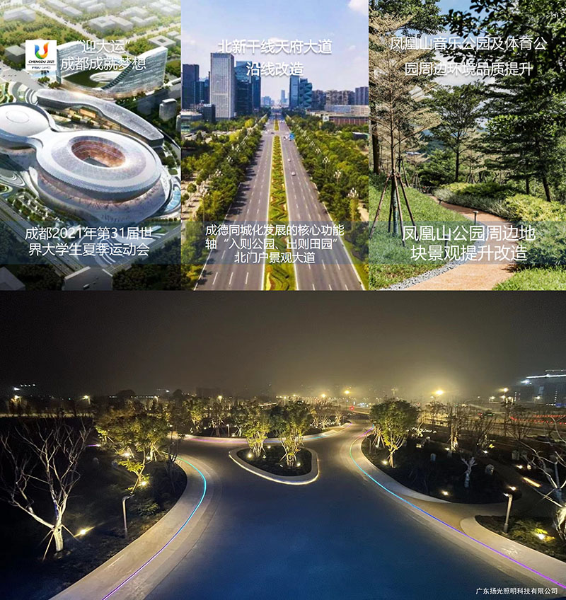 北星大道是成都向北聯(lián)系德陽的主軸,也是2021世界大學(xué)生運(yùn)動(dòng)會(huì)的重要賽區(qū)所在地。而整個(gè)片區(qū)夜晚環(huán)境不足以表達(dá)區(qū)域特色,因此對(duì)北星大道兩側(cè),鳳凰山露天音樂公園及國(guó)際足球中心周邊場(chǎng)景進(jìn)行整治,既是大運(yùn)會(huì)期間的風(fēng)貌展示,也是城市發(fā)展的重要需要。