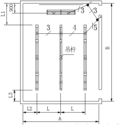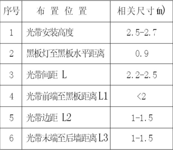 2.布置規(guī)律:.黑板燈平行于黑板、課桌燈垂直于黑板布置,相關布置尺寸參見表2。特殊情況應以照度計算為準,例如美術教室教室的照度標準為500lx,光帶間距可能調整至1.8-2 米。
